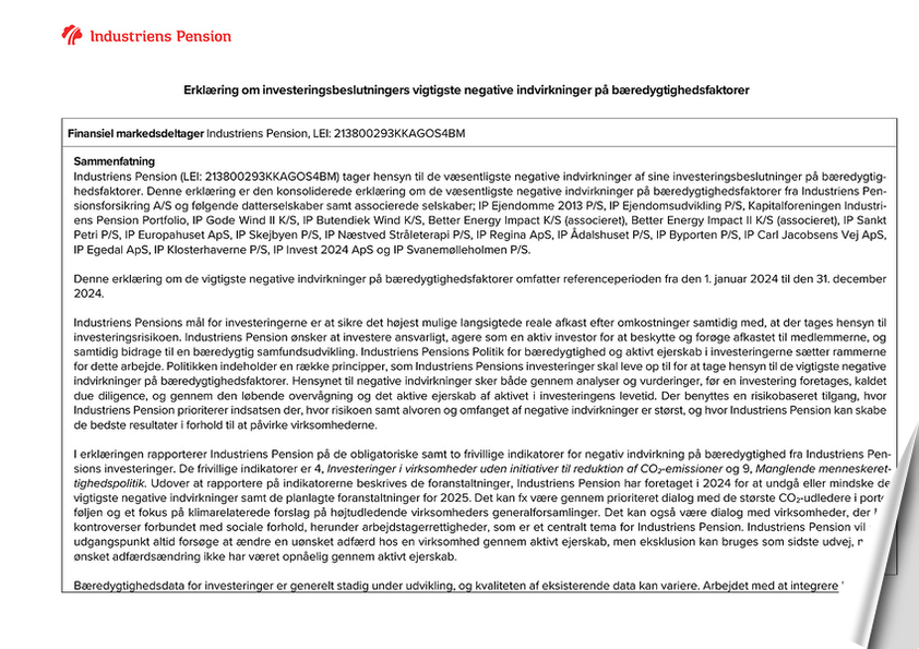 Industriens Pension (LEI: 213800293KKAGOS4BM) tager hensyn til de væsentligste negative indvirkninger af sine investeringsbeslutninger på bæredygtighedsfaktorer. Denne erklæring er den konsoliderede erklæring om de væsentligste negative indvirkninger på bæredygtighedsfaktorer fra Industriens Pensionsforsikring A/S og følgende datterselskaber samt associerede selskaber; IP Ejendomme 2013 P/S, IP Ejendomsudvikling P/S, Kapitalforeningen Industriens Pension Portfolio, IP Gode Wind II K/S, IP Butendiek Wind K/S, Better Energy Impact K/S (associeret), Better Energy Impact II K/S (associeret), IP Sankt